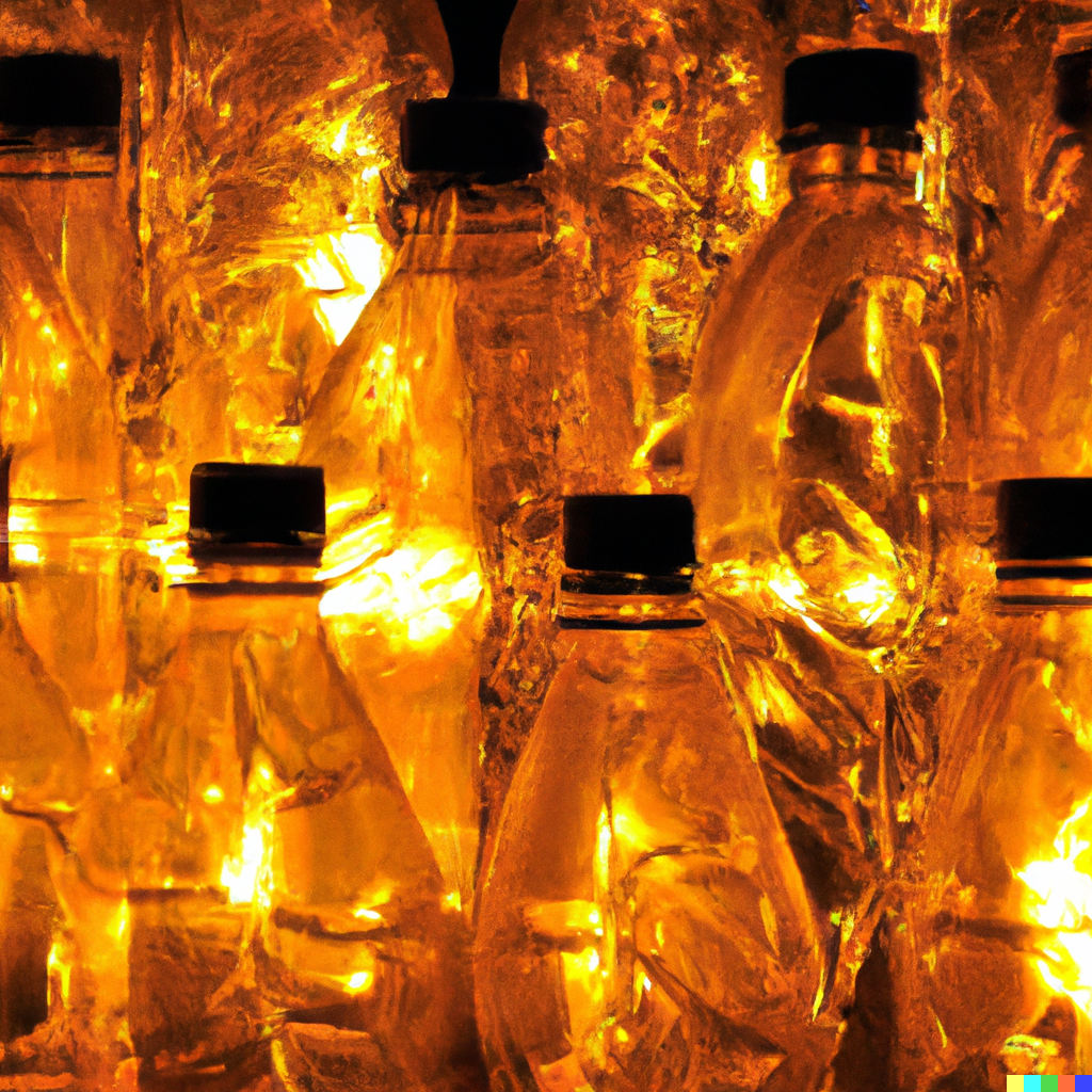 DALL·E 2024-02-14 23.02.18 – a cluster of plastic bottles with orange led light inside them