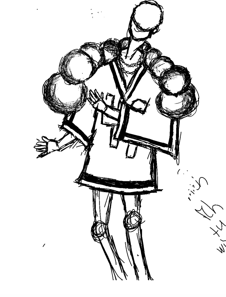 What I think is crucial about my project is the shape of its frame, being the large shoulders and the slim body. To give the piece shape I wanted to personify a triangle shape with the outfit and body. What I did in the opposite style aesthetic, was add large puffy jacket shoulder pads and added an oversized jersey under it. The puffy shoulder pads had a similar role to the metal shoulder pads, in pushing the shape out in the shoulders and letting the bottom be flowy. The oversized jersey, is a similar role to the chainmail, being something flowy and not form-fitting.
