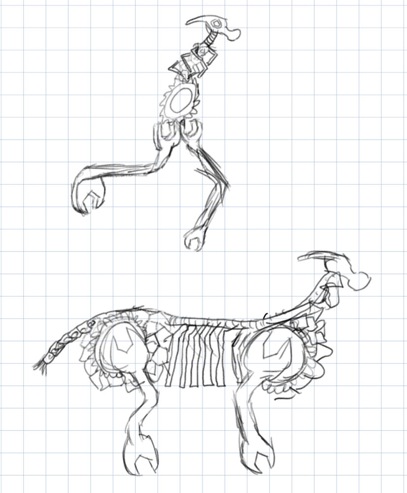 For my upcycle project, I have decided to create a piece of scrap metal art out of used fasteners. My initial ideas were to create a sculpture of a person, possibly in the middle of an action or in a specific pose. I got most of my inspiration from my cousin, who is a sculpture artist currently in Glasgow, where she commonly uses various metals as her medium. I also have been inspired by metal garden sculptures seen at a garden centers. I have created some basic sketches of ideas (shown in figure 1) and I thought it would be really cool to use allen wrenches to imitate rib bones and a hammer head to replicate the head of an animal or some sort.