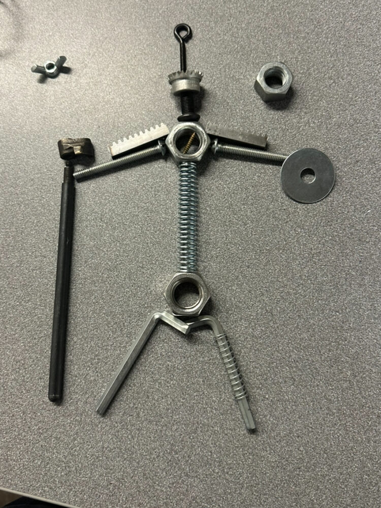 Unfortunately, this has been a really busy semester for me so I didn’t have a lot of time to source any used tools, so this steered me to use basic fasteners to make it simpler to source. I used the Ideaforge supply closet to source most of my materials. Things that caught my eye were springs, gears, and odd sized bolts. My plan was to browse around to find random things, then I would be able to mess around with trying to make a person or animal. This was a fun process where I had to look at every piece from a different perspective, discovering what can be used to replicate what (i.e. arm, leg, head, hat, etc.). I went through a couple designs I liked, one being what looked like a king with his staff (Figure 2). Another was a cool looking pendant or ornament of some sort (Figure 3).