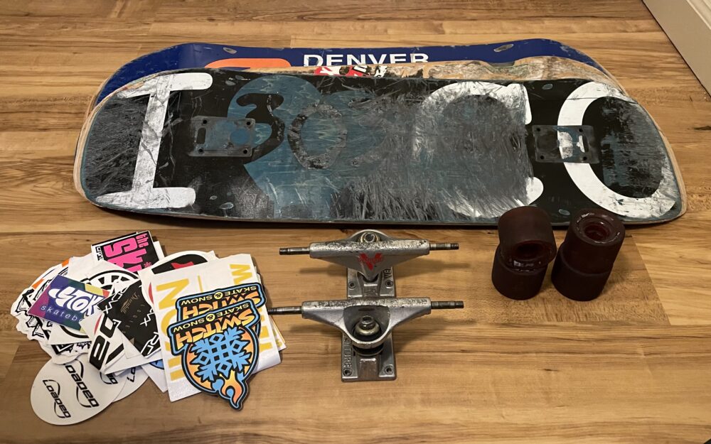 With my design completed I started by gathering some of my old skateboard/longboard equipment from home. I also grabbed a bag of stickers I had saved up over the years. Out of the 3 board I had to choose from I chose the one with the most wear and tear on the back, but the least damage to the edges.