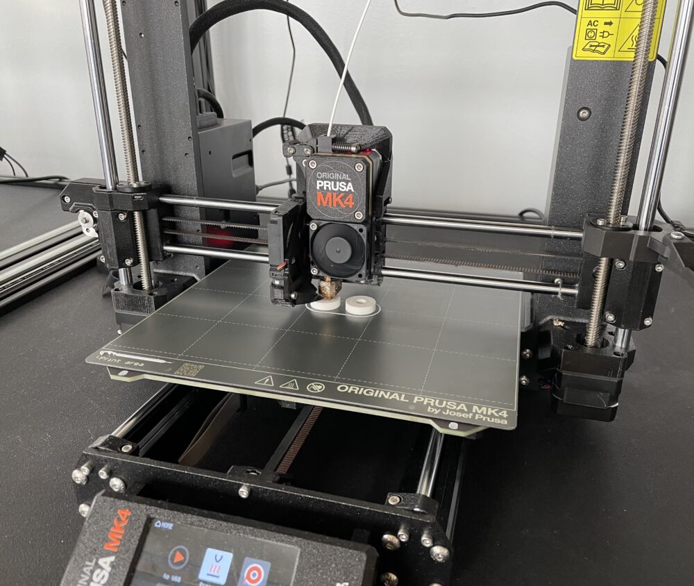 One thing Josh and I talked about was making a rig to help me sand the flat spots on the wheels. For my rig, I found a piece of scrap wood and simply drilled a hole 19mm from the edge. I used this rig to sand one wheel at a time so that each wheel would have the same depth flat spot. To secure the wheel to the rig and stop it from spinning I needed to 3d print plastic placeholders for the bearings. I quickly made a 3d model using the standard dimensions of skateboard bearings and printed them for free at the ITLL.