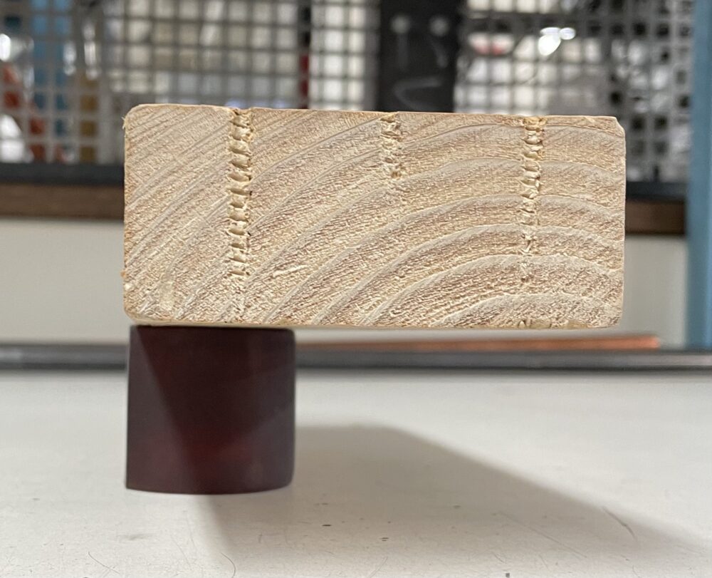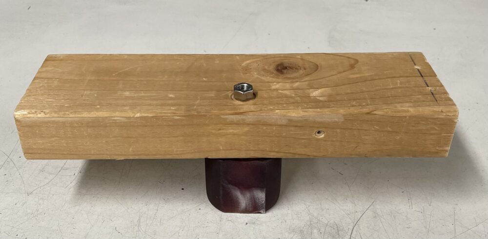 I ran into trouble trying to cut the second piece for the ledge since there were limited options for securing the board in place. I made the decision to just use one of the thin cuts for the ledge. I bonded the ledge to the base of the board using wood glue and then drilled 4 hole for mounting the truck. After assembling everything I had the functioning stand shown below.