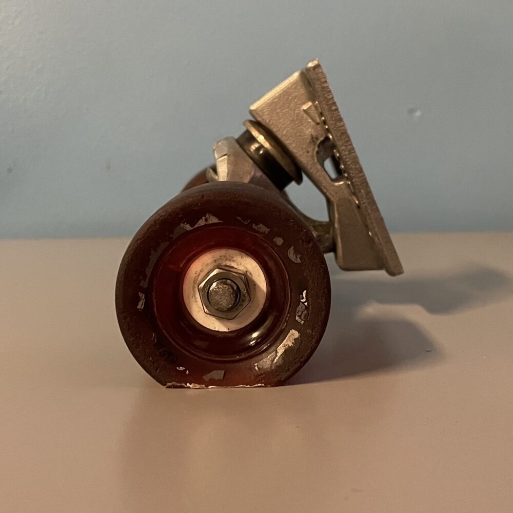 I remembered I had some old skateboard decks at home so I knew I wanted to use one of those as the backboard of the iPad holder. Next I needed a way to support the deck at a slight angle. Back when I was longboarding every day, I remember our wheels used to get flat spots from holding long slides. This would force us to get a new set of wheels and while a flat spotted wheel would be useless for longboarding it would work just fine as the base of my iPad holder. For those who do not know, the image below shows what a flat spotted wheel looks like. I planned on exaggerating the flat spot until it reached the core of the wheel so that the base of the ipad holder would be stable.