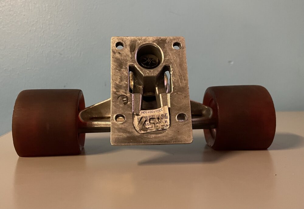 Next, I inserted the bearing placeholders into the wheel and secured it to the rig using hardware I grabbed from the ITLL project vault. Once I flat-spotted both wheels I secured them to a skateboard truck to complete the base of my stand. The image below shows what the rig looked like fully assembled as well as the completed base of my stand.