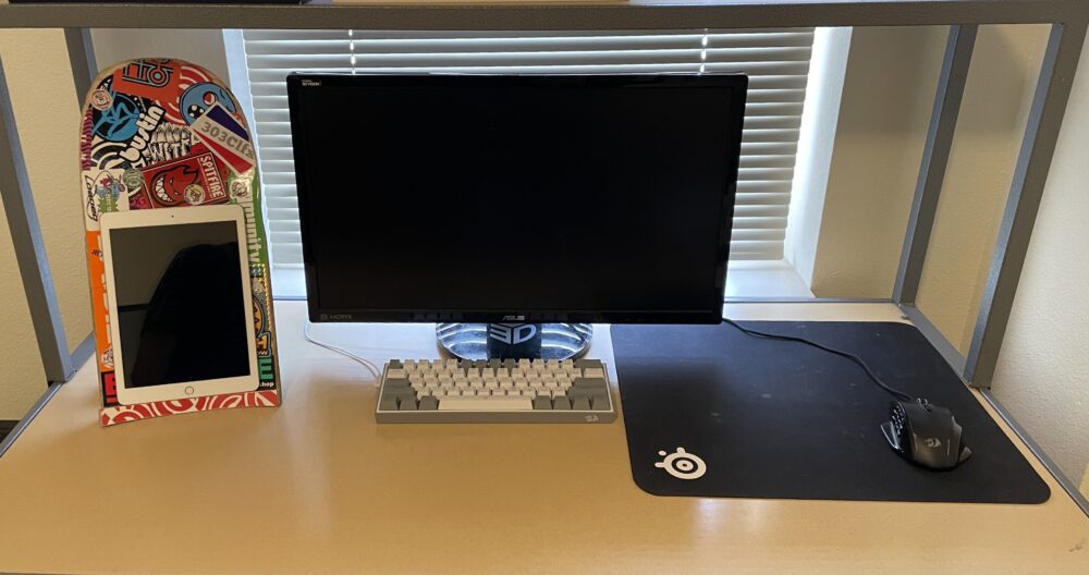 The base of the deck then comes into contact with the table was not completely level so the stand had a slight wobble. I used a sander to level the base and now it is very stable. The final step was to cover the front in stickers. I started with square stickers to line the straight edges of the board and cover the interior surface. After that I used the round stickers to line the round edge of the board and filed off any stickers hanging over the edge. Then I placed many stickers overlapping the others to get the look I wanted. The images below show the final product, which I am very happy with. In the future I would like to add a hole for a charger and possible a way to secure the iPad to the stand, but for now I accomplished what I set out to create.