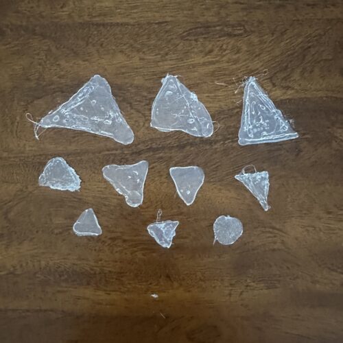 After letting the glue set for the plastic bag layer I moved onto the tread of the shoes I had thought of using a rubber mat but I wasn’t able to find one for a reasonable price. So I decided to use the rubbery nature of hot glue. I had a bit of trouble deciding on the form of the grips and tried making them into a triangle shape because I thought if I wore through them then they would be an easy shape to replace. However I was not satisfied with the resulting aesthetic because I thought they did not look very clean. So I switched to the circle design which I ended up making about 60 hot glue dots for each shoe.