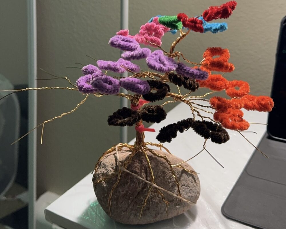 The culmination of my efforts is an intricately crafted bronze-wired bonsai, delicately perched atop a Rocky Mountain stone, adorned with vibrant clusters of pipe cleaner leaves, resembling blossoms in bloom.