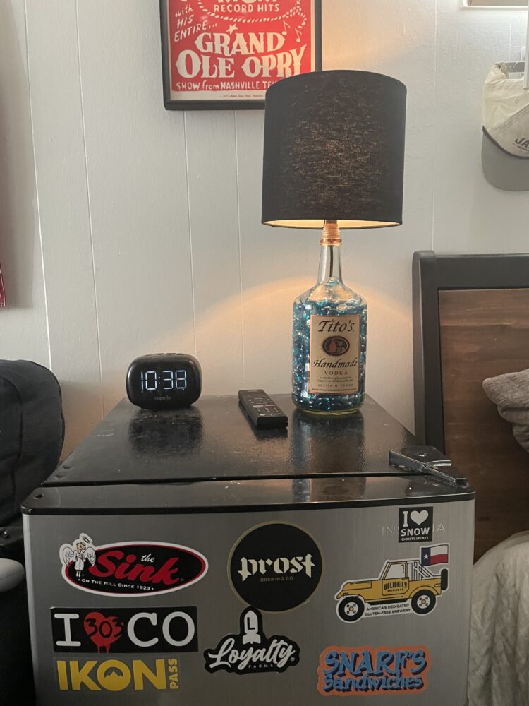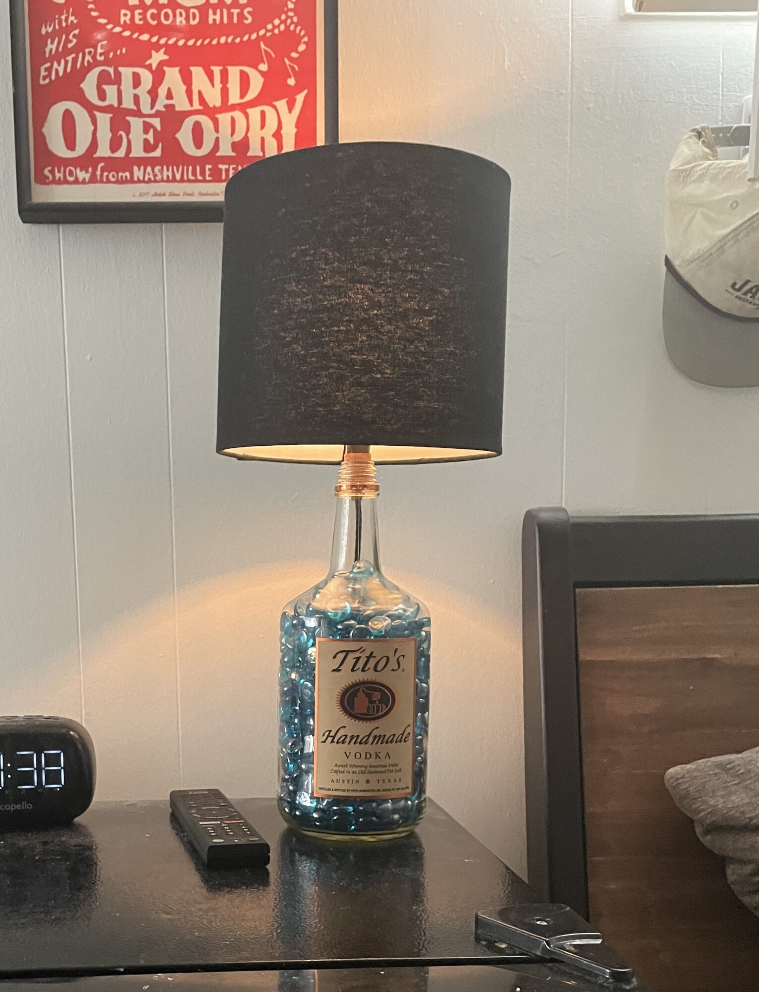 So far everything was going smoothly, but I still needed to find a lamp shade that captured the specific aesthetic I was trying to achieve. This proved to be very difficult. I went to Goodwill and Facebook marketplace hoping to find a lamp shade that would work, but I came up empty handed. However, I did have a dark blue lampshade that matched well with the Tito’s bottle. I kept an eye out for speakeasy lampshades while holding the Tito’s bottle as a backup.