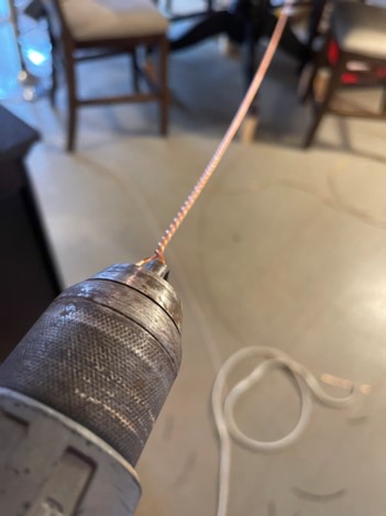 This image represents the setup I used to twist the copper wire to create the illusion of my rock climbers rope. As previously stated, by utilizing my electric drill I was able to significantly reduce the time required for this stage of my project.
