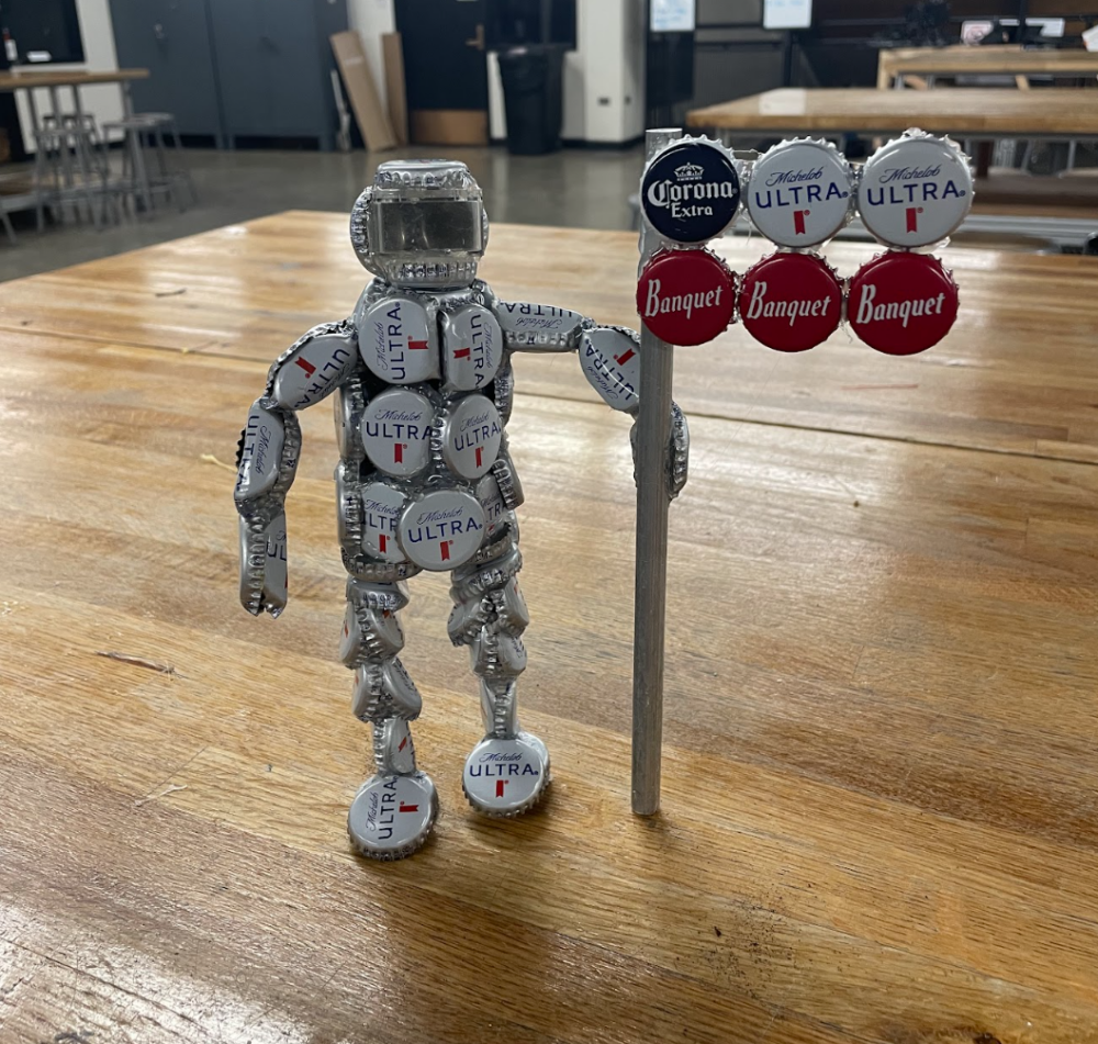 The piece will sit on a floating shelf in my room near my growing bottle cap collection, and one day maybe I’ll make him a friend! Overall I really enjoyed fabricating my project and I am very happy with how it turned out.