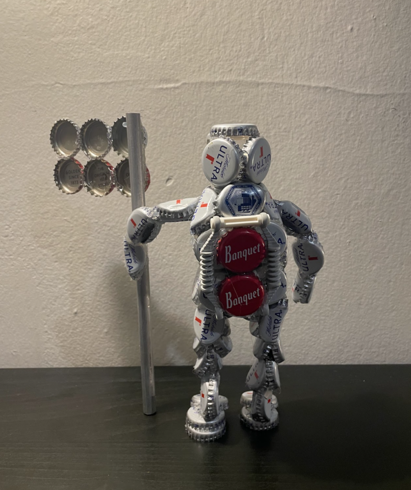 Hey Duncan, this looks absolutely amazing! I loved how you used the different bottle cap colors to distinguish the different features on the astronaut. This is such a cool project for your chosen aesthetic and I think you portrayed it very well. Also how long did it take you to collect all of those bottlecaps?