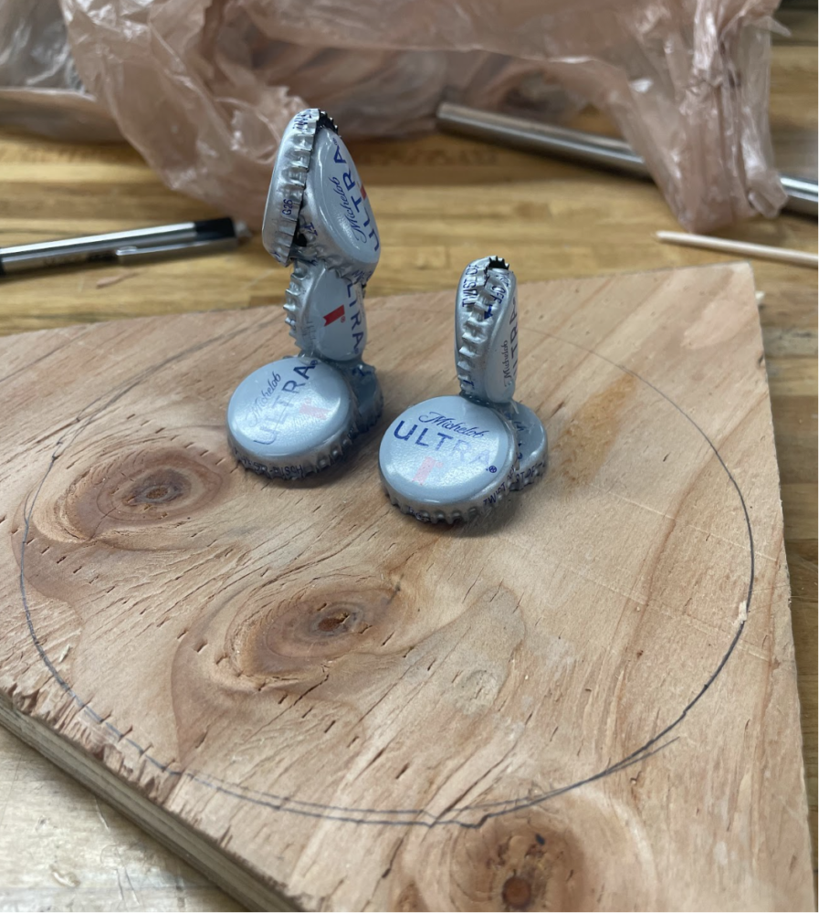 In order to give a sleeker look to the limbs of the astronaut, I used pliers to bend the caps slightly so they could fit into one another and not show the inside of the bottle cap. I found a scrap piece of ply wood that I was going to use for a circular base, so I traced a circle in case I wanted a base and needed it to be cut. I was still unsure if I wanted to use a base plate, so I worked on the legs inside of the circle so I knew I was keeping the total figure to the size I wanted. I worked up the legs, hot gluing two caps on at a time. The legs ended up being 3 sets of caps long.