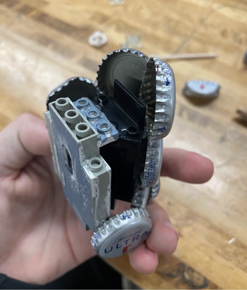 After the legs were completed, I realized my initial drawing where I had the bottle caps stacked in a single column would not be larger enough for the scale of the legs. I found 2 structural Lego pieces in the Idea Forge and glued them together which made a great size and shape for the torso. I hot glued white bottle caps all around the torso, and then connected the legs by gluing on the torso. I also found a clear window piece in the Idea Forge Lego bin which works very well for a helmet visor. I made the head separately by gluing four white bottle caps into a square shape around the clear Lego piece. I added a backpack to the astronaut’s torso using 2 red bottle caps and 2 Lego pieces resembling piping or ventilation.
