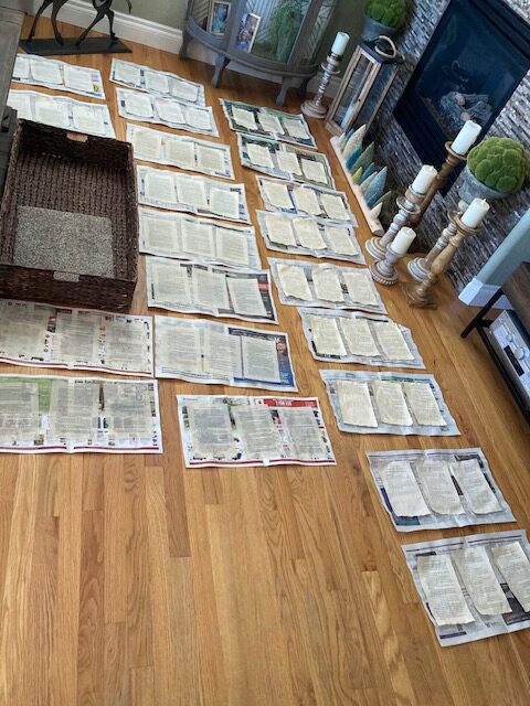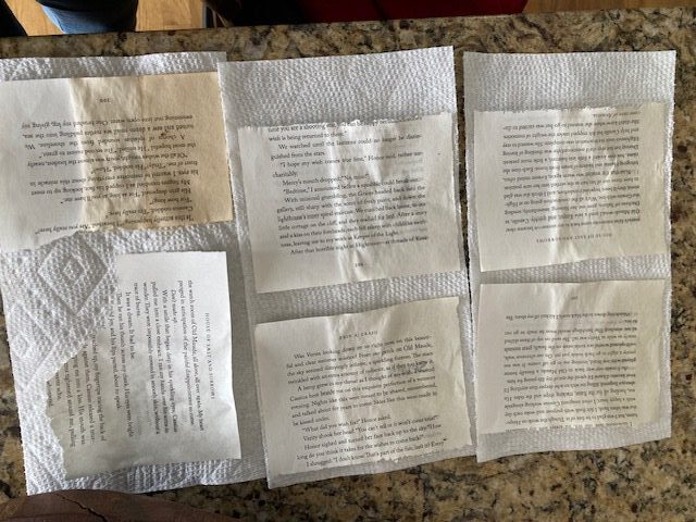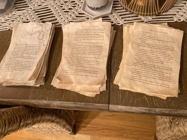 Once dipped, I then had to lay out each page so that could dry out. I dipped each page twice, waiting for the pages to dry completely after each dip into the teas. In the end, I dipped close to 200 total pages of paper (almost 400 pages of written story).