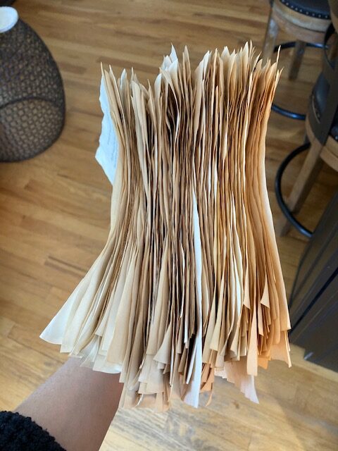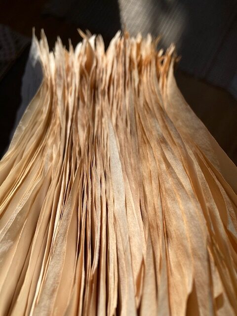 Having completely dried, I collected each coller into separate piles to more easily keep track of which pages were dipped into which tea. There’s not too much visible difference in color from afar, but when observing closely there is a more discernable difference, especially on the edges.