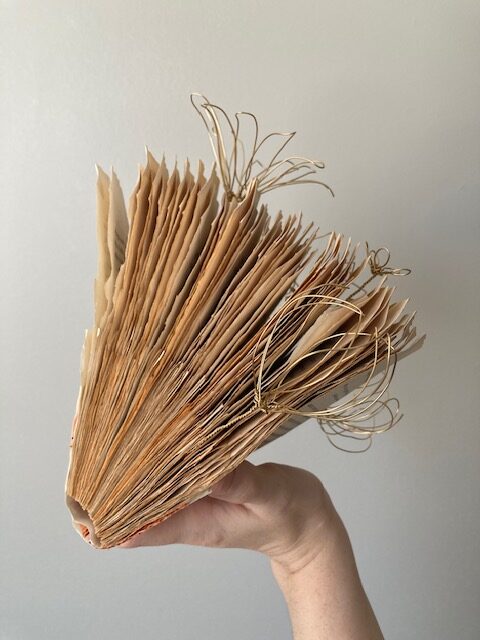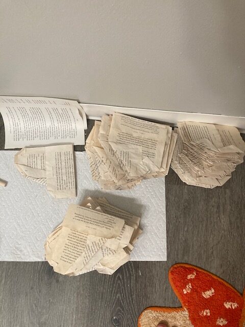 I had wanted to use a duplicate book that I had to create some sort of artwork, but I didn’t want the pages to be as bright white as they were. I remembered seeing people on TikTok and various social medias spilling coffee and tea on their artwork to create something new that they could make more elaborate or special. When thinking about how to make something more than simply a tea stained book, I thought about mushrooms and fungi. There’s a kind of mushroom that grows off of tree or vertical things that looks as though it has a flat top, almost like a shelf, and I deciced to try to emulate that kind of look with the book pages instead of just creating that classic button top mushroom that people tend to think of when they think of a mushroom.
