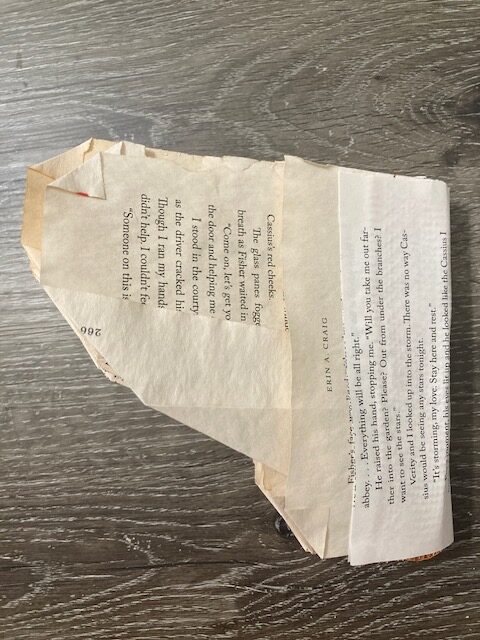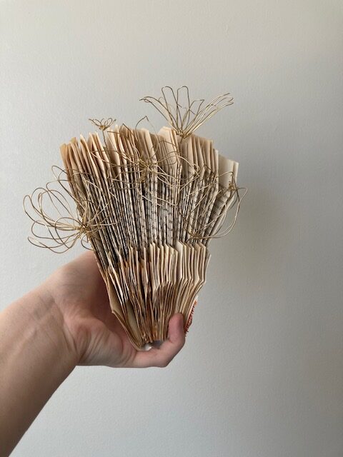 I wanted my project to somewhat resemble a mushroom while clearly being made of book pages. It was always meant to be a decoration, whether that be something that could be placed on a shelf or hung on a wall. I had started by trying to create something resembling the fungi aesthetic, but it transformed into more of a cottagecore aesthetic by the end.