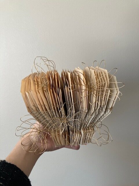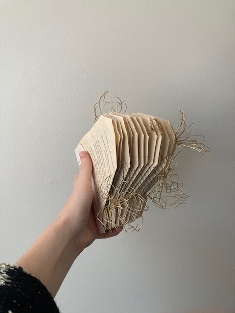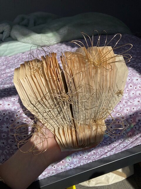 There was no change in the function of my final product as it is still something I can use as a decoration on either a shelf or as a wall hanging. As of this post, it lives happily on my bookshelf. Artistically, I did not use every page that I had orignally intended to use, but the final product outcome has not become worse from the lack of these pages. In fact, I believe that the lack of these pages helped me to come up with using wire flowers as I believe they have amplified my project to a whole new level of aesthetic beauty. The slight change of aesthetic description is something that I’m not mad at either as it still resembles a sort of mushroom, however loosely you might see it, just in a softer, more cottagecore kind of way.