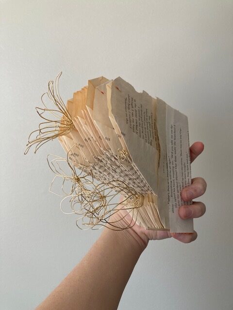 However, it didn’t feel complete to me, so I thought about simple things I might be able to add to it and decided on creating wire flowers that I could add as if they were growing out of the pages, almost like mushrooms and fungi do in real life. I took some spare wire, practiced a little, tried to copy the look of real flowers into wire, and finally created some flowers that I thought looked beautiful together as well as folded into the pages. I think it turned out even better than my original idea and I am by no way upset with the final form or aesthetic that I ended up with.