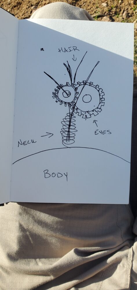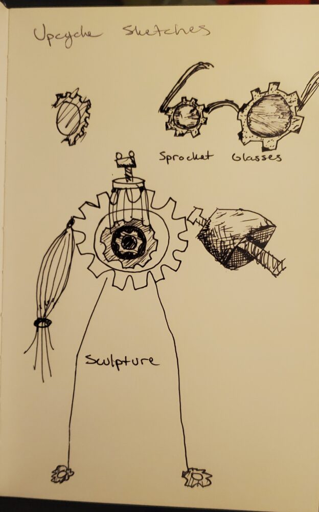 Using these parts as my reference I initially sketched up some designs for potential sculptures. I settled on the weird looking gear man in the bottom left of the sketches shown below. I think his little eyes on the top of his head resembled a frog which I thought was funny. However, as I got further into the project I knew I was going to need big round eyes if I wanted to make it looks cute. Below is another sketch I had simply focusing on the face of sculpture. I thought mismatched eyes of different sizes on a thin little neck would be really funny and cute since it is so weird.