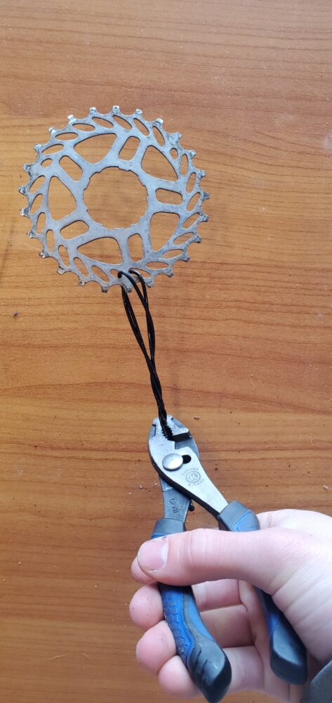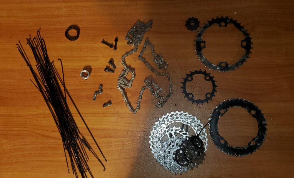 Below is an image of the raw materials I was working with for the project. This pile of junk consists of bike spokes, wire, chain rings, a rear cassette, a bike chain, nuts and bolts, and a random spring.