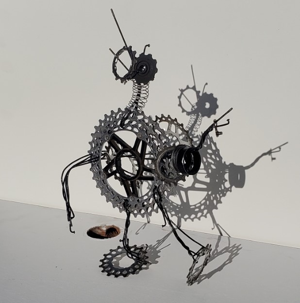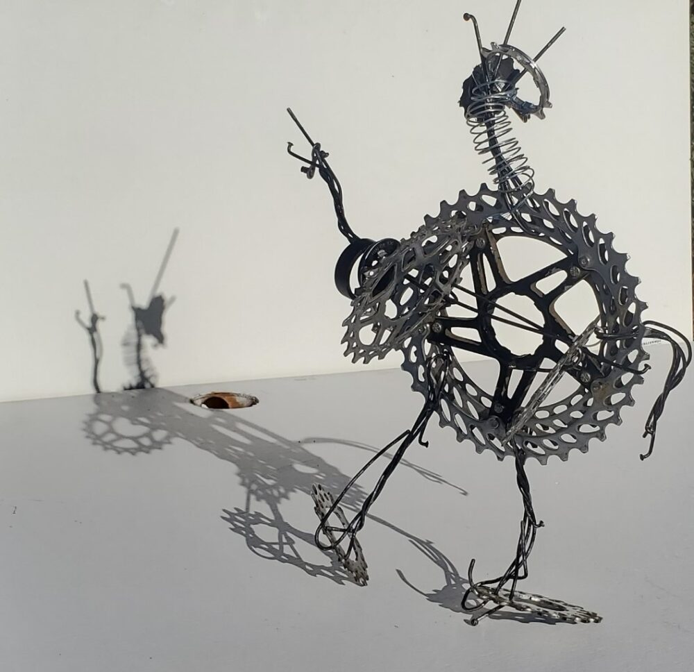 The “Industrial Disco Man” is striking his best dance pose in the images below. I really love this first picture because it looks like he is dancing and doesn’t care who is watching. The other pictures show the other angles of the sculpture. I like the way his eyes came out, since they are off center and disproportionate in size. The artifact is a compilation of numerous scrap bike parts including spokes, gears, and springs.