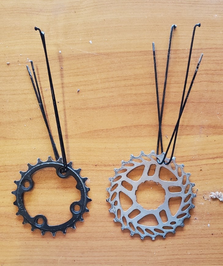 First thing was I inserted the bike spokes into gears I would use as the feet of the sculpture.