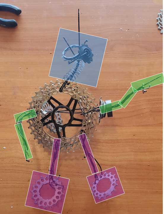 From here I wrapped the legs (purple boxes) around the central cassette. The cassette was going to be used as the central body of the entire sculpture. The legs were then twisted one last time to ensure they held on well to the body. I then had to fiddle around with the position of the feet gears to allow the sculpture to balance properly. Once it could stand on its’ own two legs I started working on the arms (green boxes). Similarly to the legs I wrapped the bike spikes around a gear and twisted, However this time I only wrapped around the middle cassette so the individual spokes would resemble fingers. The arms were in a very rigid straight position. I started to manipulate them along with the legs to put the sculpture into the “disco man” position. I chose this pose because I wanted the sculpture to be doing something uniquely human. This would allow the audience to quickly impose human characteristics onto the mechanical amalgamation. I was hoping if they saw it as human, the small form factor would help add to the cuteness. If it wasn’t in a very human position then I think people would be confused as to what it was and I wouldn’t realize my artistic vision. The final step in the assembly process was adding the head (blue box). I followed the same steps as before, wiring the spokes through the gear and leaving one end free. I twisted the spokes together and then added the spring to represent the neck of the little guy. Finally I wired in the miss matched gears for each eye of the sculpture.