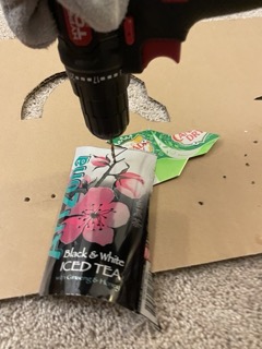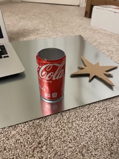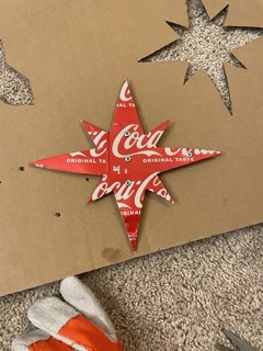 This is the step by step for how I fabricated the base of the starburst on my design. First I sketched a model I was happy with onto a cardboard sheet. Then I used a boxcutter to cut out this shape and trace the design onto a sheet of aluminum ducting that I was going to recycle. This aluminum backing was meant to give stability to the thin soda cans while keeping the signs low profile that I was aiming for.