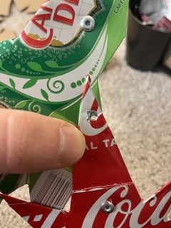This is a step by step of how I trimmed down the cans. Hole, rivet, trim, and fold. In addition the final photo shows the backside of the sign where you can see the riven poking through, and that folded overflow of the soda can. After this I drilled holes into the top bottom and left points of my starburst and riveted the rocket and starburst together.