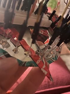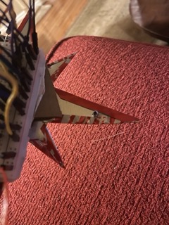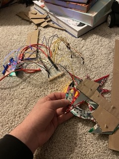 This is an image of how I implemented these electronics into the sign. First i setup all of the wires and LED’s separately, so that if I encountered any errors I knew they happened during implementation. To attach the LED’s I placed the leads through a pre-drilled hole and hot glued them onto the back. I did this in this way so that the fastening would not be visible on the front of the sign, giving it a “cleaner” look, and so that all the LED’s would be at an equal height after fastening.