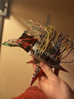 Brandon, this looks really good. I think you absolutely nailed the aesthetic you were going for – I think if you showed me your project without telling me what the intended aesthetic was, I would still connect it to that style of architecture. And I’m impressed by your implementation of electronics, especially the way you manage to create a sense of motion/animation with the lights that adds to the ‘story’ of the design. I do agree that ultimately the metal can designs turn out a bit cluttered in the final product, but I think the broader colors of the cans you used fit the aesthetic and would have worked well together if the cans weren’t so visually busy. If you were to tackle this again, how do you think you would get around that issue? Would you try painting the cans, finding a different source of metal, or something else?