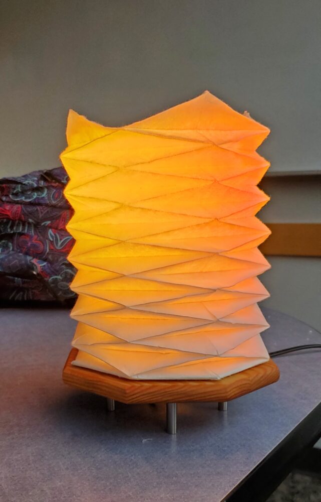 The final product came out really nice. I can’t imagine trying to create that cylindrical shape with all of those folds, that must have taken a lot of patience. I wonder if using a different type of paper would make that process easier. I was thinking maybe wax paper but that might not be as durable as regular paper. I know you can get specialty origami paper but I don’t know enough about it to offer that as a suggestion. I know Kyle mentioned fire precautions, I wonder if there’s a bulb that gives off less heat as a conventional lamp bulb. Might be something you could look into.