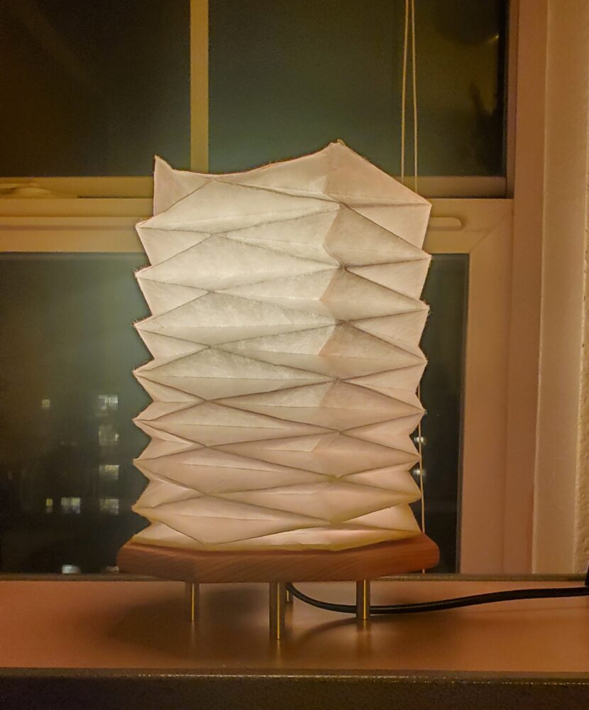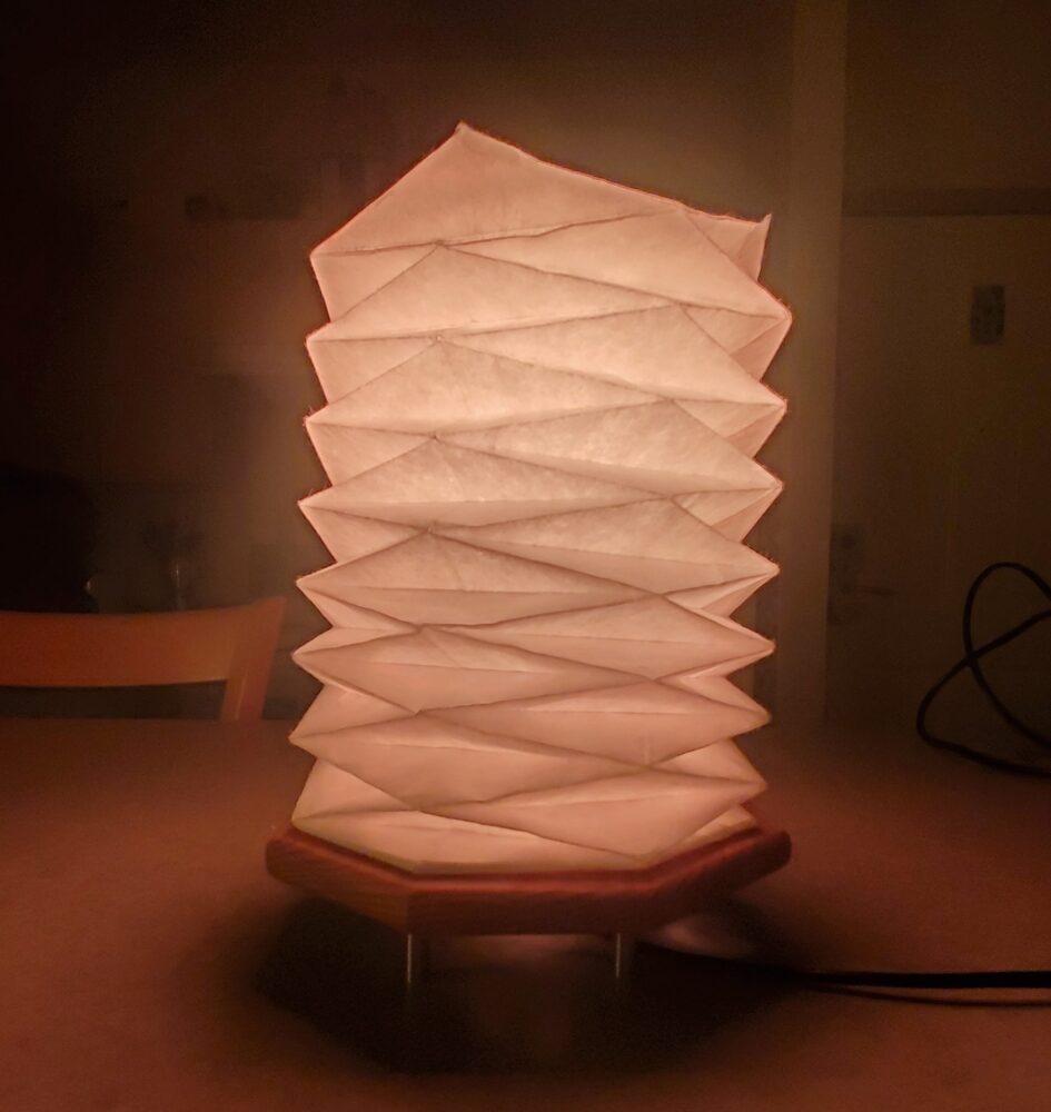 I started with a white sheet of 16” by 21” paper, which I folded according to a standard Yoshimura folding pattern. The hardest part of this pattern was turning the accordion-like, flat structure into a cylindrical component. The folds felt like they were fighting me the entire time, and I almost burst out a corner multiple times. Once I finished the pattern, I glued the two ends together using wood glue and attached a paper topper to the lampshade, also with wood glue. when I glued the final paper component together I tried to make the topper fold in a way that is reminiscent of a lotus flower. The following is an image of the final polyhedral with the light bulb turned on inside: