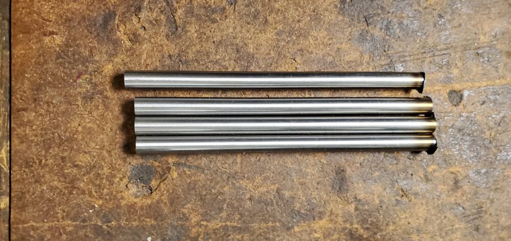 I scratched the idea of using wooden pegs for a more contemporary design of using stainless steel rods to add much needed texture variety and contrast into the design. I sliced steel rods down with a grinding wheel and then used an angle grinder to clean up the rods to not have sharp edges. The next photo is of the rods before I ground down the ends.