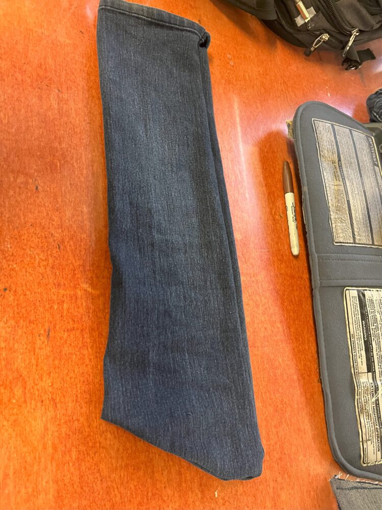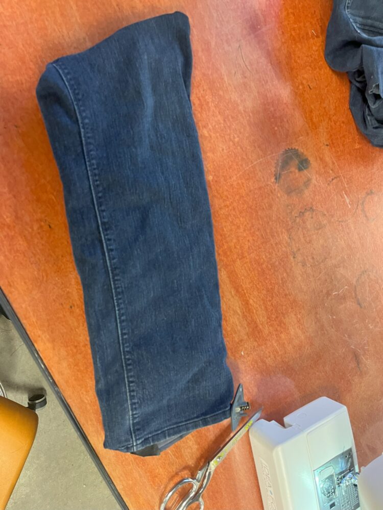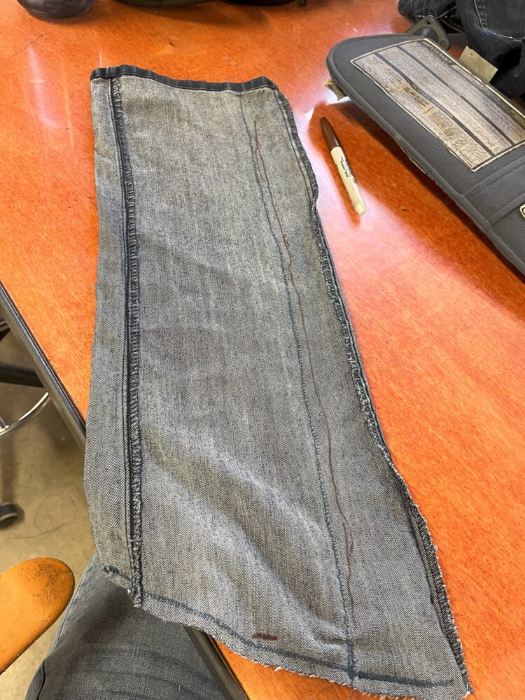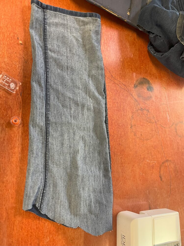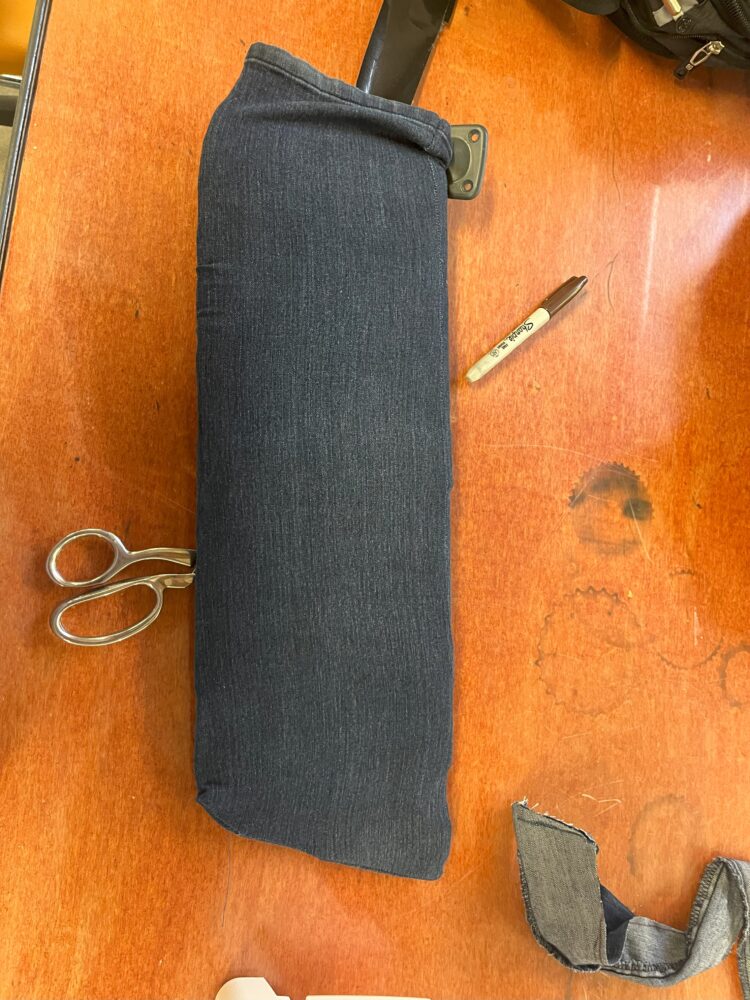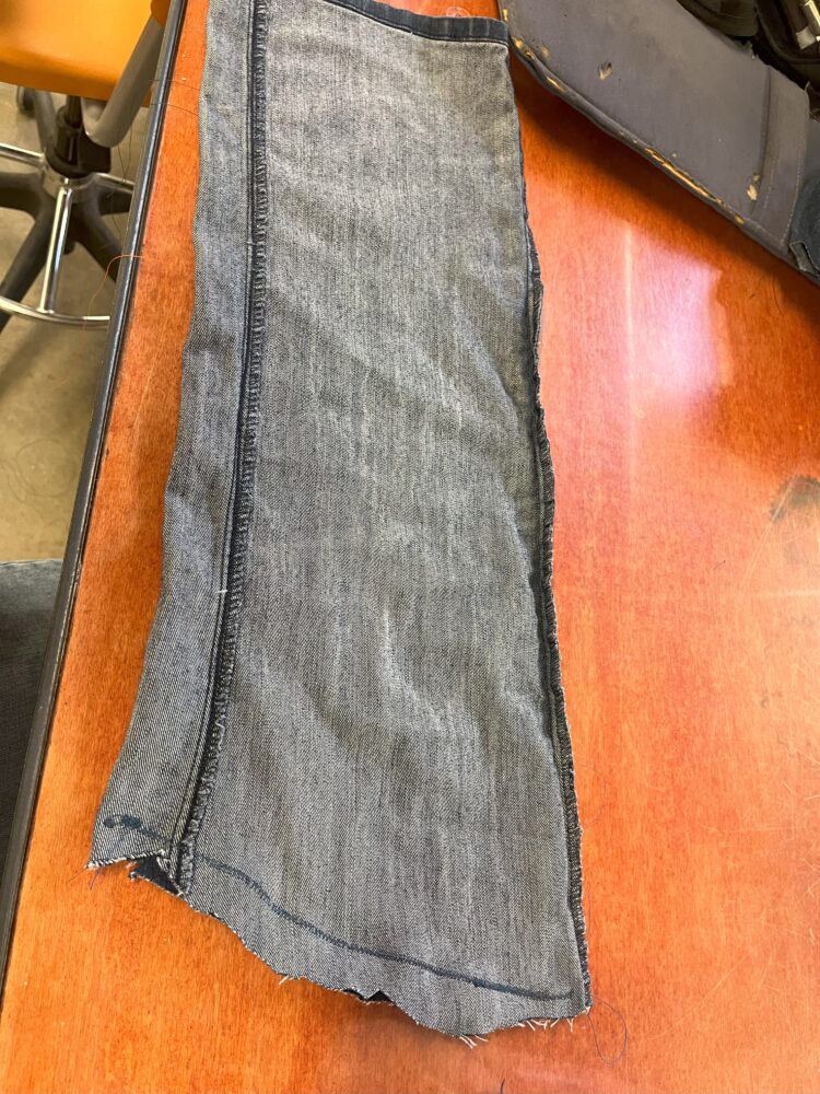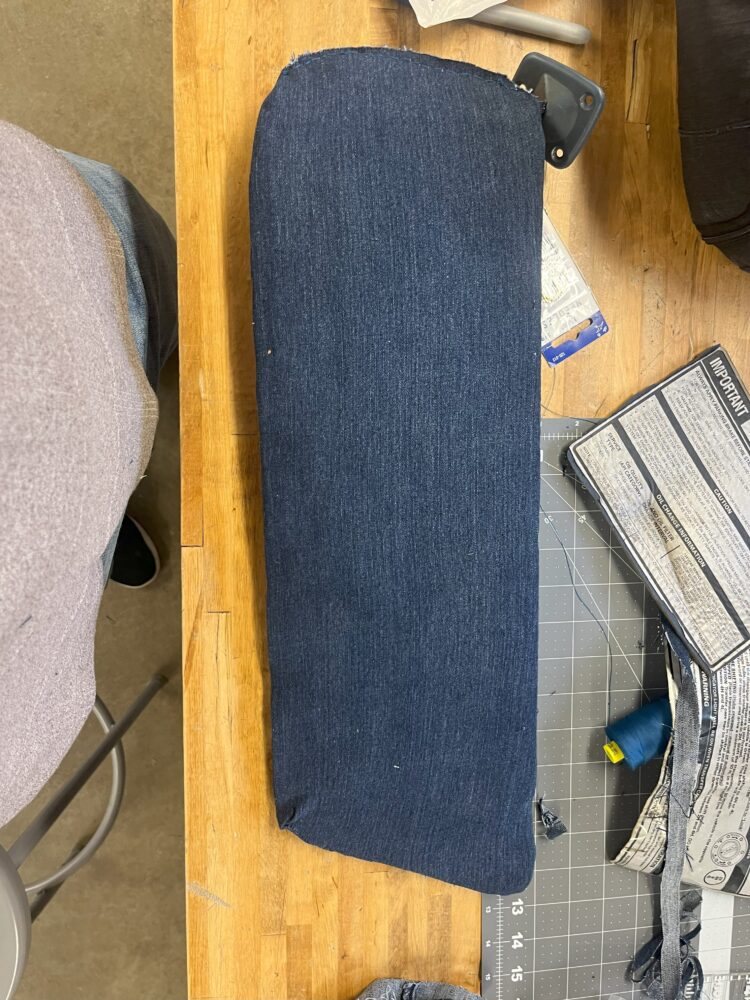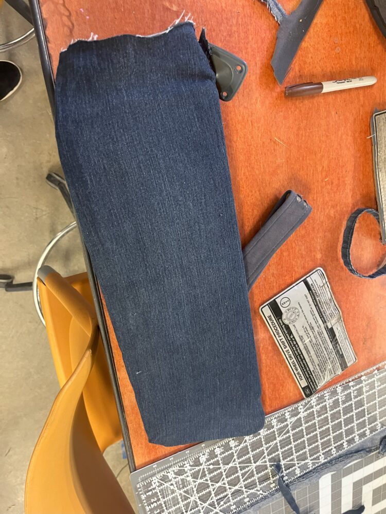 Most denim cannot be stretched, so I chose to use an old pair of jeans that is partially polyester to have a more lenient material to work with. This ended up working out great, since I could intentionally undersize the encasement, creating an even tighter fit than I think I could have achieved with traditional denim. This did take a few iterations; the first size of the encasement was much too large since I tried using the original tube of the jean leg. I had to re-sew and trim the encasement an additional two times to get a fit that I was satisfied with. Once I got there, I felt accomplished and at ease, since this was the main hardship I was expecting.