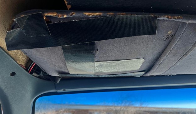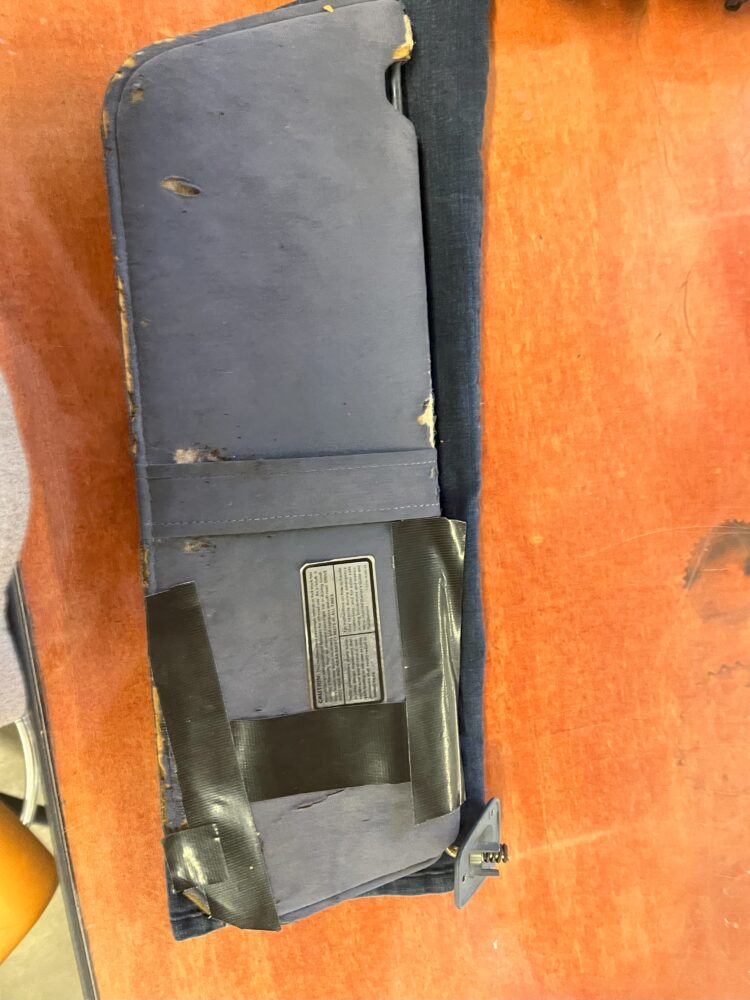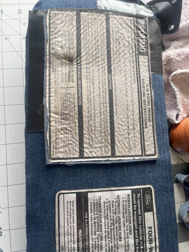 I took a sewing class in middle school, so machine stitching was easy, but I haven’t learned how to hand stitch before. Using the internet to learn how to backstitch and finish up the encasement was a highlight of this project, since it’s always great to learn such useful skills. At that point it was just a matter of attaching the informational stickers from the original sun visor. I managed to do this exactly like I planned earlier in the project: by using contact adhesive to stick the original sticker and foam-backed sticker to the new fabric. One of the stickers lacks a plastic coating and therefore was not intact, so I chose to take it with the thin foam it was glued to. This lead to rough edges on one of the stickers, which were easily covered by strips of denim. See the images below for the full construction process and final product when installed.