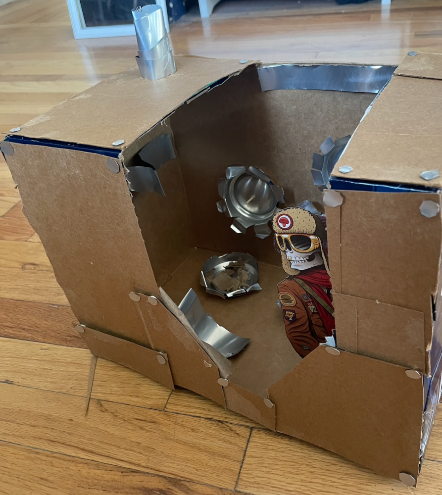 After my dynamics were done, all of my fabrication was focused on the aesthetic and the story. I tacked inside out box components on the outside of my box, with cut out aluminum to give the illusion of bolts. I then placed more non-functional gears on the inside, as well as more aluminum pieces that play into my vision of fantasy for my machine. My vision is that this plant is what’s on the inside of one of the flying machines in the first photo of this post. The machine takes trash and converts it to energy which is used to propel the aircraft forward. The top chimney is where the steam/exhaust leaves, and the character in the front is the technician of the engine. Below are some photos of my final result, although it is impossible to get everything I want into a single photo due to the orientation of the box.