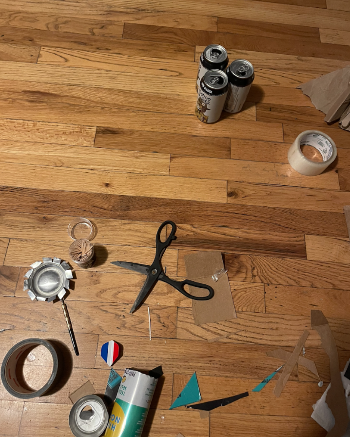 After coming close to solving the contact problem between the gears, and cutting my desired slot in a beer box, I started attempting to place them on the walls inside of my box. Getting these gears fastened tightly inside the box, positioned properly, as well as functioning in a way where they can interact with each other smoothly, was the hardest, and most time consuming portion of the project for me. I ended up creating spacers for the outside of the box which connected to the driving portion (tooth picks) of the gears. This is shown in the image below, next to the image of the mess I created along with some of the simple tools I was using.