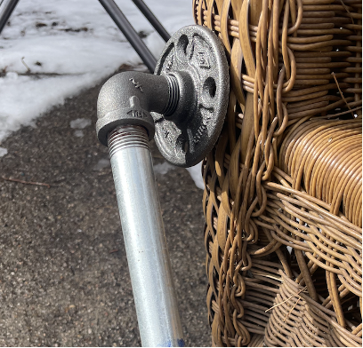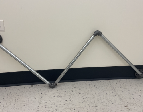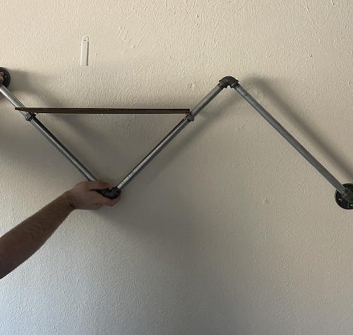 The biggest initial roadblock which held me back was finding proper materials. Initially, I wanted to use curtain rods to make my shelf but after being ghosted on multiple Facebook marketplace I decided it was time to go a different route. I decided to go explore in home depot to find some pipes in the used section. After a short search, I was able to find galvanized steel gas pipes and figured they would work perfectly. Below you can see an image of my piping assembled.