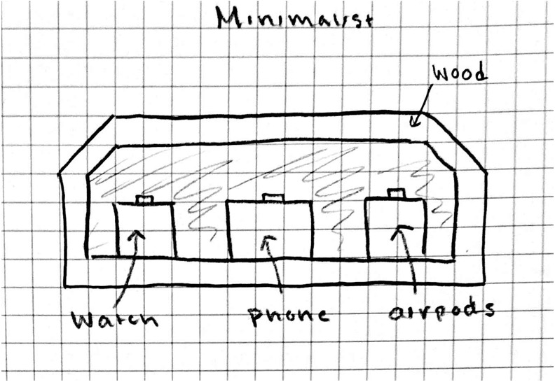 My main project aesthetic is going to be minimalism. This aesthetic is characterized by monotone colors and a lack of complexity. The reason I like minimalism as an aesthetic for my main project is because I am going to use this project on my desk as a charging station and it would fit the aesthetic of my desk setup. My current plans for the project is a charging station that has 3 ports, for iPhone, AirPods, and a Watch. The material I am leaning towards is wood for its simple and consistent tone as well as ease of manufacturing. Another reason why minimalism is good for this project is because I plan on using the charging station to hide wires and connections that make the desk look messy.