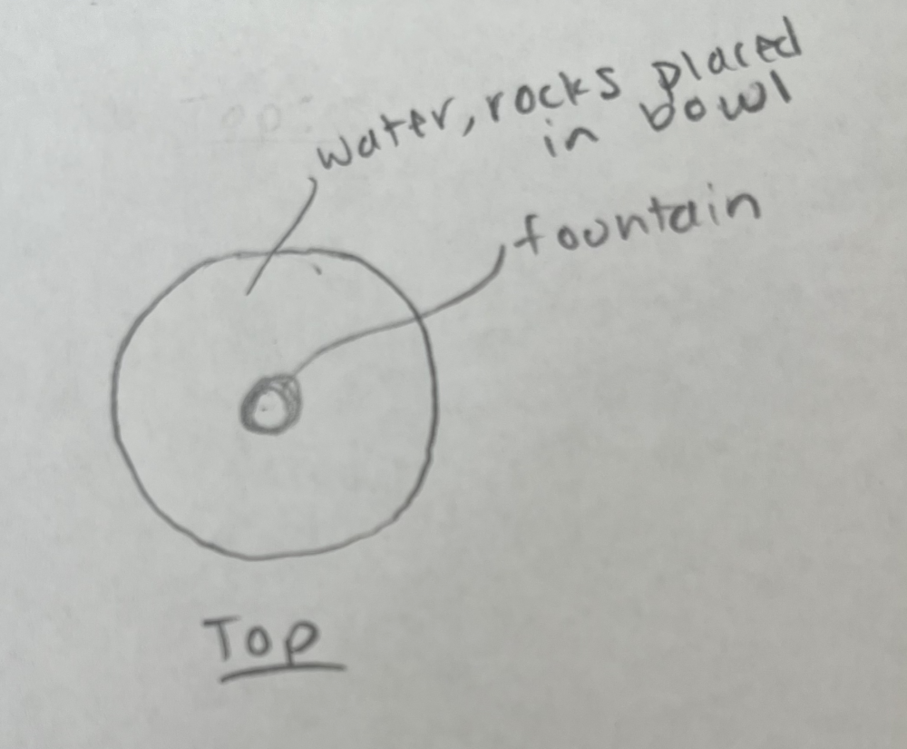Currently, the cabin does not have a birdbath, so I plan to create one made out of concrete and adorned with small, thin metal tubing. The following sketches are my initial ideas.