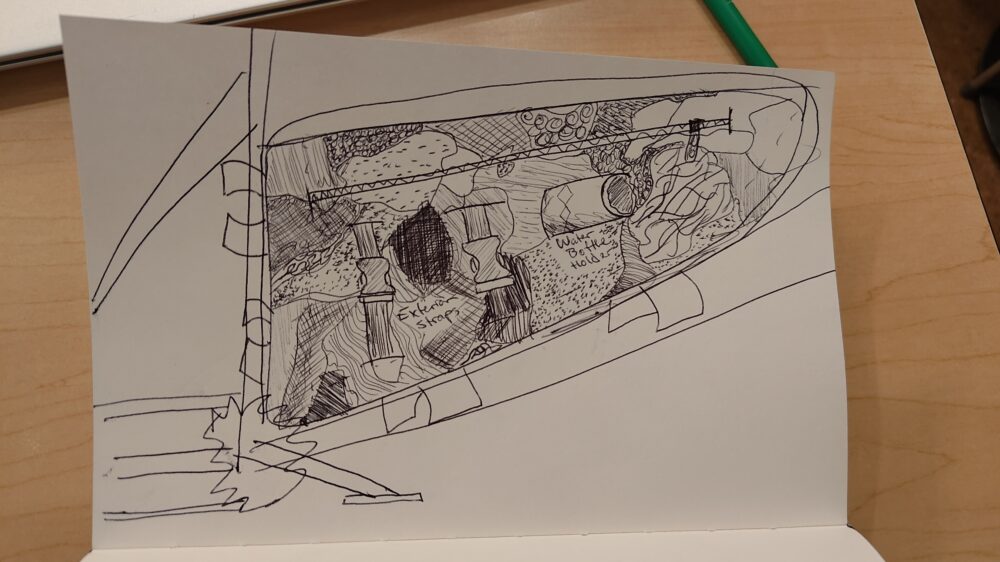 These two sketches below are the opposites of my aesthetic. The first drawing here shows an example of identical bags that are mounted into the frame. The point of the sketch is to show the jerry rigged aesthetic. This idea shows that a simple all purpose design can be incorporated into multiple ways to get a similar performance to a custom purpose built bag. This solution isn’t very aesthetically pleasing because it forces the product to be used in an unintended way.