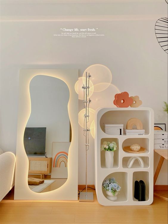 1. My top specification is to make a mirror in the Organic Modern aesthetic. I really like how this aesthetic looks in an interior design space and how it is able to go with a versatile amount of pieces. I want to create a functional piece of furniture that also acts as a design element that can be used in many different spaces. I hope to continue to use this mirror in the future and other living spaces since it is minimalistic and more sophisticated. I hope to achieve this by using either a neutral colored wood stain or a white paint for the wood as well as a semi transparent acrylic for the lighting feature. I am planning on not adding a mounting feature because I personally have never used a hanging floor length mirror in my space and I always have my mirrors leaning against a wall. An example and inspiration picture for something I am going for is pictured below.