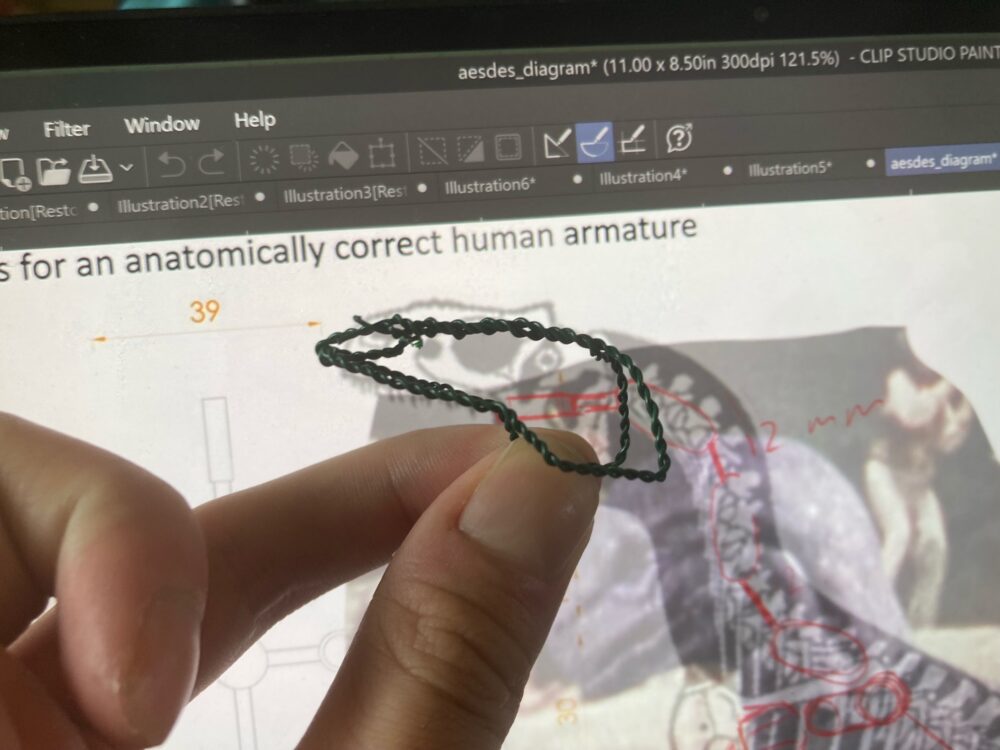 The armature is stainless steel joints with some armature wire attached for the tail. I still need to add arms and toes to the armature. I have made a few test arms so far: one of the metal parts didn’t work quite the way it was supposed to, but I can achieve the effect I need with minimal revision, so it should be simple to get the final arms made. And the toes will just be made from wire, so that’ll be pretty easy too.