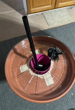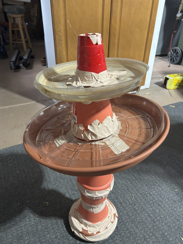 Two weeks ago, I purchased all of the materials to fabricate the birdbath. From Home Depot[], I bought plastic pots, saucers, duct-tape, and concrete mix. After beginning project fabrication, I purchased more materials that I realized I would need, including a large bucket and strong mixing sticks. The final cost of materials came out to be $110.00, including the pump that I found for this project.