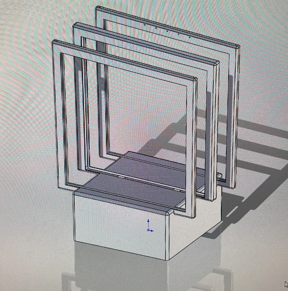A large portion of my design process was creating many different revisions of the similar models. My goal was to 3D print a frame which can hold up my three main pieces- a mirror, an LED strip, and a 2-way mirror. After receiving peer feedback, as well as talking to those who operate 3D printers on campus, I revised my design a total of 4 times. Each revision was tailored to another constraint that the 3D printers have. The main constraints were geometry and printing time/material. Below is a sequence of my revisions, starting with my first on the left and ending with my final design.