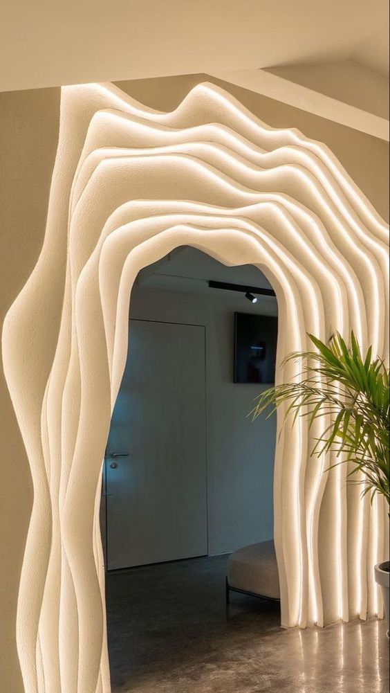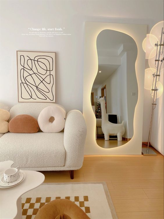 I loved the idea of incorporating a modern aesthetic with an organic natural take to create a piece of furniture that is unique but can be used in many different spaces. Once I decided on the type of project and aesthetic I wanted to create, I decided to do a wavy framed mirror with a dynamic lighting feature. In order to stay within the organic modern aesthetic I looked to use neutral colored materials and incorporate wood into the project. I started to find inspiration and research on these types of mirrors and also learn more about woodworking since I have little to no experience. I did plan to use the laser cutter to do the wavy design itself since I know how to use the laser cutter and I felt like this would be the most consistent for the design since it is complex. I then needed to decide how I would cut and assemble the rest of the mirror and the wiring of the led lights. The design I ended up creating was a little more complex than the ones I took inspiration from because I decided to create two “frames” out of wood and then enclose the led lights with foggy acrylic to let the light shine through. I was overall inspired by the organic modern aesthetic and the curvy nature of the interior design, from abstract shaped furniture to neutral and beige color schemes.