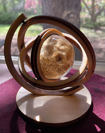 This is a really cool final product! I really like how the first half-ring is inset to the base. The gold glitter and the cut wood compliment each other nicely. Also impressive that it has survived some unplanned drop tests! Overall aesthetically pleasing project with evidently a lot of thought put into its meaning.